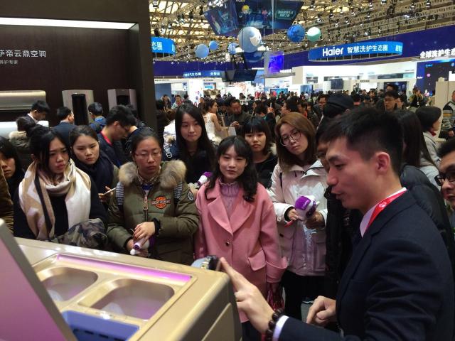 依据工业设计专业试验班培养目标,为开拓学生眼界,增进其与业界的交流和互动,提升学生的设计实践能力,欧乐电影 于3月10日下午组织工设13级以及14级试验班学生参观了在上海新国际博览中心举办的中国家电博览会(AWE2016)。家博会(Appliance & electronics World Expo, 简称AWE)由中国家用电器协会主办,是目前家电行业规格最高的大型综合性展会。此次受参展企业海尔集团之邀工设专业近四十名师生参观了海尔展厅,并聆听了旗下品牌——卡萨帝(Casarte)系列新品的专业介绍。