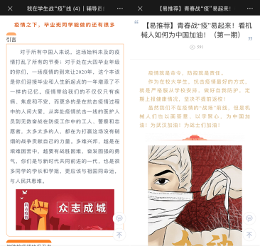 学院密切关注学生的思想和心理状态,加强疫情期间学生的网络思政教育和爱国主义教育。以易班网络思政平台为主阵地,面向师生等不同群体开设“我在学生战‘疫’线”、“战‘疫’堡垒”、“青春战‘疫’易起来”等专栏,通过辅导员的抗“疫”日记、空中系列主题班会、抗“疫”文艺作品等形式,讲好疫情防控中的中国故事,利用这一场没有硝烟的“全员战争”,借助社会这个“大课堂”、人民群众这位“好老师”,上好一堂生动而难忘的爱国主义“思政大课”。