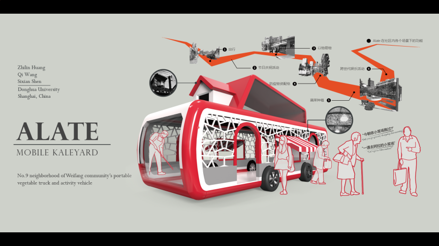 本次欧乐电影 代表团队Alate的参赛作品,基于对上海浦东潍坊九村的实地调研,了解到在流行病期间小区关闭了几个入口,进而挖掘了老年人难以购买蔬菜的需求痛点。此外,团队观察到社区内部的合作和人际交流因隔离而减弱,因此设计了“Alate Mobile Kaleyard”,它不仅是一辆可以引进小区原有的蔬菜供应资源的蔬菜车,还是鼓励生活在同一个社区里的不同人群交流的社区活动工具,可实现功能包括种植蔬菜和举办社区老物件展览等。它不仅为购物提供了便利,而且旨在重振社区代际联系。