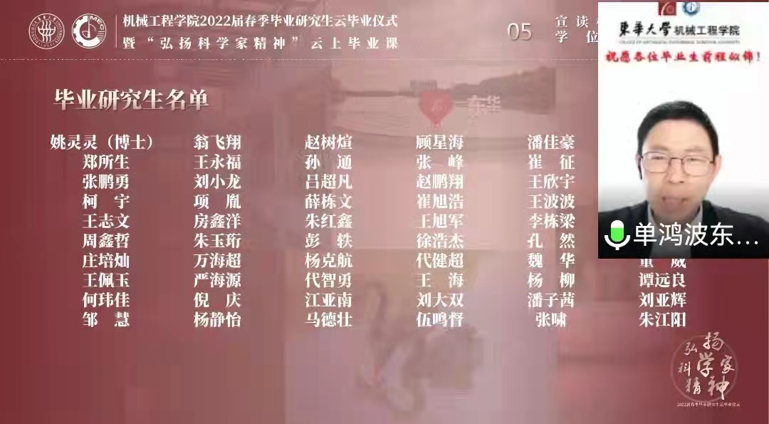 3月28日,欧乐电影 2022届春季毕业研究生云毕业仪式在云端举行,师生同上“弘扬科学家精神”云上毕业课。学院党委书记王新厚、院长单鸿波等全体党政班子成员、导师代表、辅导员、春季毕业研究生以及部分家长代表等100余人相聚云端,一同分享了这一喜悦时刻,仪式由学院党委副书记李宁蔚主持。