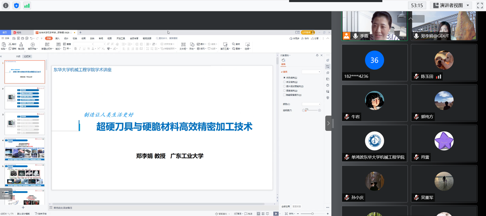 4月26日,国家优秀青年科学基金获得者郑李娟教授受邀为欧乐电影做题为《超硬刀具与硬脆材料高效精密加工技术》的学术报告。院长单鸿波、部分中青年教师、行业技术专家、博硕士研究生等线上参加了本次报告会。报告会由院务委员季霞老师主持。