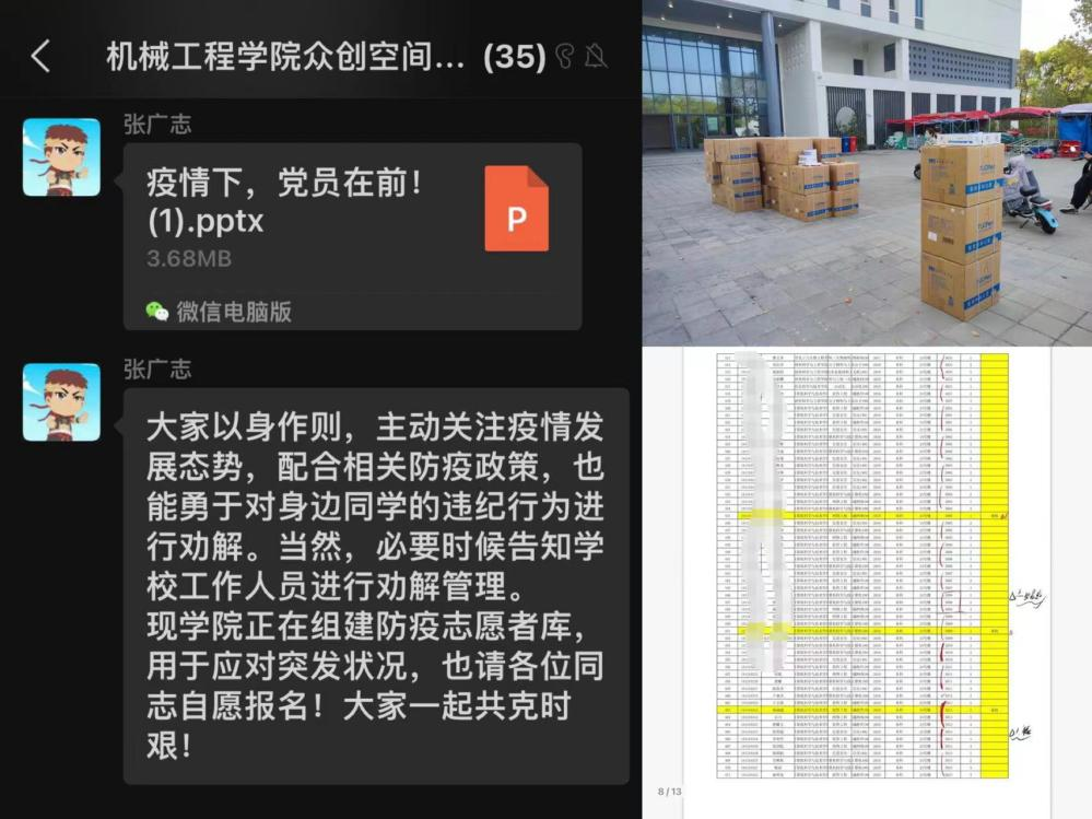 一个支部就是一个堡垒,一个小组就是一片阵地,一名党员就是一面旗帜。”面对严峻的疫情,支部党员不畏艰辛、冲锋在前、勇担重任、扎实工作,对照学院党委《欧乐电影 疫情防控常态化工作预案》,带头推动落实各项工作,彰显了当代青年党员的使命担当和卓越风采。众创空间为本硕博一体化党支部,支部党员纵跨多个学段,为提升工作效率,支部迅速组织各年级党员成立党员志愿先锋队,建立起宿舍楼宇党员先锋岗,各党员积极配合并分担所在年级的各项数据统计工作,高效落实相关防疫措施,确保及时准确掌握每名同学的具体情况。