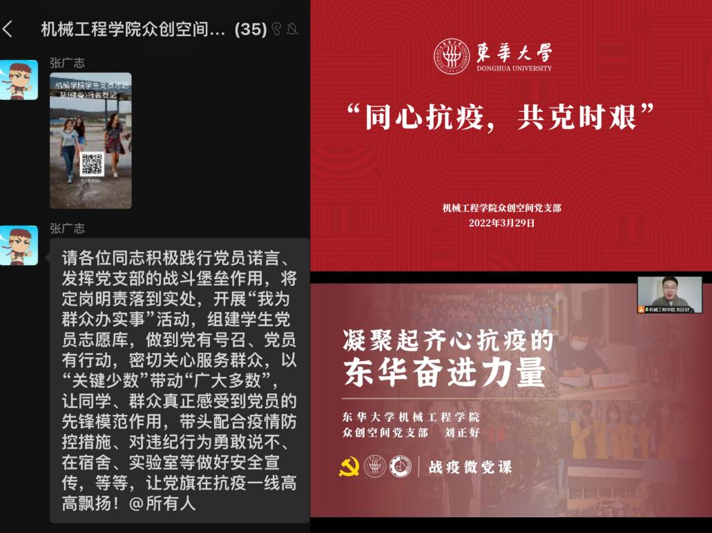 在这里,每一位东华人守望相助,充满温情,是你们让我相信,东华人永远团结,东华人永远站在一起!”支部党员刘正好第一时间响应学院党委号召,结合自身经历主讲“让党旗在防疫一线高高飘扬”系列战“疫”党课,从《凝聚起齐心抗疫的东华力量》的角度引导支部党员深刻体认“国之大者”;329日,支部召开“同心抗疫,共克时艰”主题线上党日活动,进一步引导支部党员在疫情防控工作中厚植爱国主义情怀、强化责任担当意识、彰显拼搏奋斗精神、坚定必胜信心。