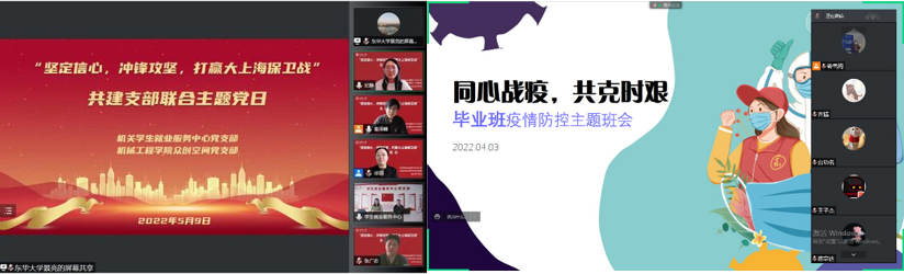 学院党委、各党支部和广大党员诚恳听取群众意见建议,及时回应师生需求,更好地暖人心、聚人心,筑牢群防群控防线。本硕博一体化的众创空间党支部与“全国党建工作样板支部”欧乐电影 学生就业服务中心党支部开展联学会议,坚决把思想和行动统一到习近平总书记重要讲话精神和党中央的决策部署上来,落实好上海市委和学校党委工作要求,共同发布《坚定信心,冲锋攻坚,打赢大上海保卫战》抗疫倡议书,关心毕业班学生对于毕业论文指导和就业帮扶的需求,承诺带动一切力量,共同担负起战胜疫情、稳定就业的重大责任。毕业班党员、驻楼兼职辅导员张迅迅表示,“要守好宿舍大门这最后一道屏障,坚决巩固住来之不易的疫情防控成果,带动身边同学认真完成毕业设计、积极参加就业,展现机械学院学生风采”。
