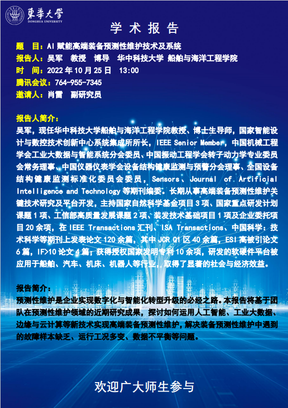 学术讲座:AI 赋能高端装备预测性维护技术及系统