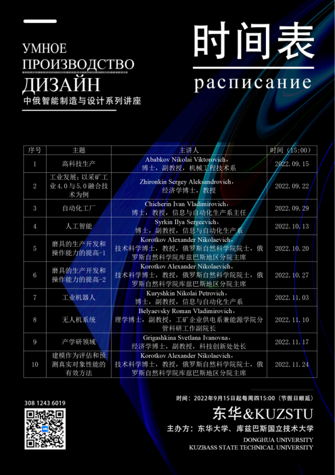 系列讲座共十讲,包含“高科技生产”、“工业设计产学研”等主题,由库兹巴斯国立技术大学科罗特科夫·亚历山大·尼古拉耶维奇院士团队精心准备,每场讲座后都与参会者进行了深入沟通和交流。库兹巴斯国立技术大学是俄罗斯重点大学,工程教育享誉全球,本次开放型系列学术讲座有效地促进了两校师生的学术交流。