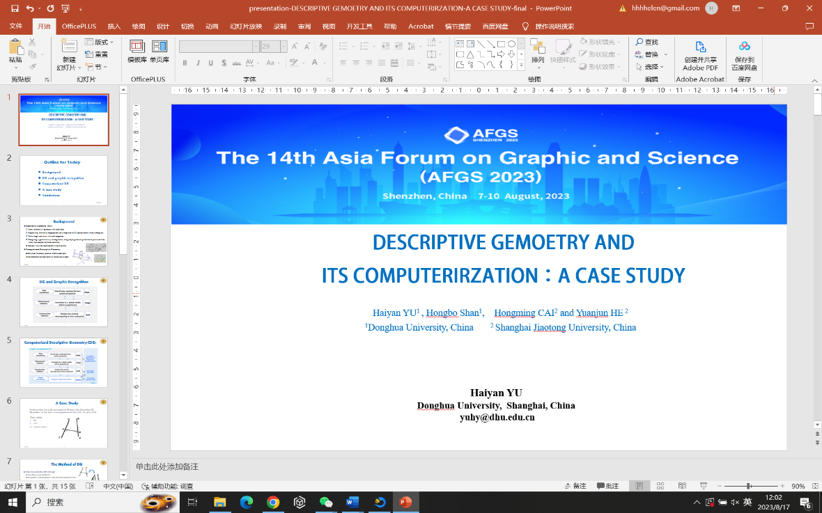 8月7日到10日,“第十四届亚太图学论坛(AFGS 2023)”于在深圳召开。本次论坛由中国图学学会、北京理工大学主办,日本图学会和国际几何与图学会(ISGG)协办。中国图学会理事长赵罡、日本图学会理事长Hirotaka Suzuki、国际几何与图学学会主席Luigi Cocchiarella分别致欢迎辞。欧乐电影于海燕副教授在会议论坛上作了题为《Descriptive Geometry and its computerization: A case study》专题报告,向国际学者介绍了团队提出的画法几何计算化及形计算理论,展示了欧乐电影 在画法几何学、图形思维以及几何计算等方面的交叉研究成果,引起与会学者专家的广泛关注。