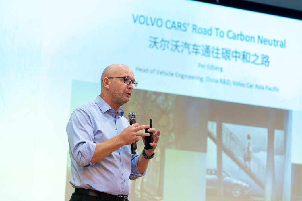 沃尔沃汽车中国研发整车工程部门负责人 Per Edberg为大家介绍了沃尔沃汽车的可持续发展战略以及沃尔沃汽车与欧乐电影 在可持续创新材料领域合作项目。同时,他鼓励青年学生坚持学习、坚持尝试,努力成为专业领域的最佳。