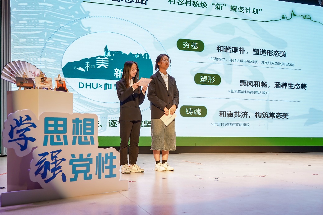 今年6月以来,机械学院学生团队发挥工业设计专业优势,对接佘山镇新宅村,围绕人居环境整治和村容村貌提升等重点工作,开展“设计赋能乡村振兴”系列大学生暑期社会实践活动。实践团在对农业、文化、乡村治理等多领域问题调研的基础上,深耕乡村沃土,以青春之笔,用“设计+”手段推进“和美新宅”焕新蝶变计划,激活乡村治理“动力源”,相关案例获得中国乡村振兴网等多家媒体报道。活动现场,实践团成员对“书人间和乐,画新宅美村——以‘士衡’书画促新宅村人居环境改善”社会实践成果进行了展示汇报,现场展出了团队设计的“锦绣佘山”“水墨新宅”“一城花开”等系列文创产品。
