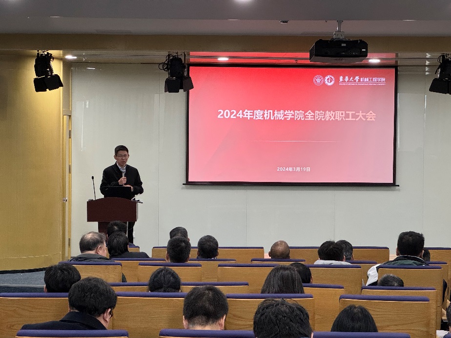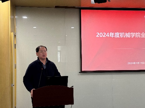 院长单鸿波指出,学院全体教职工要深入学习宣传贯彻党的二十大精神和学校第十一次党代会精神,强化思想政治引领,坚持教育强国、科技强国、人才强国的国家发展战略,把党的二十大报告精神转化为指导学院内涵式发展的行动纲领,推动学院实现高质量发展。单鸿波结合学校2024年工作要点,围绕学院2024年重点工作,分别从学院本科教育教学审核评估工作、专业学位研究生教育综合改革、高质量人才队伍培育与建设、依托特色优势学科和行业产业背景做强科研工作、学院内外部资源配置、高质量学生就业与创业工作、学院文化氛围及公益服务积分计划等方面做了详细介绍,强调以人才为基础、以创新为核心,进一步优化师资及研究队伍布局,充分发挥机械工程学科综合优势,做好国家级人才培养和科技创新基地建设,持续推动一流专业建设和创新人才培养,并号召大家以大学使命和国家战略为引导,努力构建全员育人的格局,共同营造富有人文特色、积极向上、充满阳光的学院文化,不断为学院高质量发展注入新动能、塑造新优势。