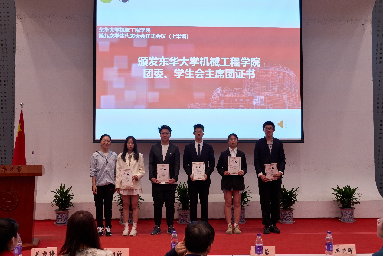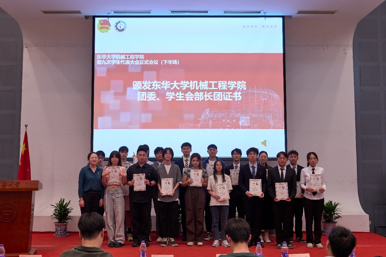 会上机械学院党委副书记杨蓉为机械学院学生会主席团颁发聘书,欧乐电影 团委书记王晓晖为机械学院学生部长团颁发聘书。