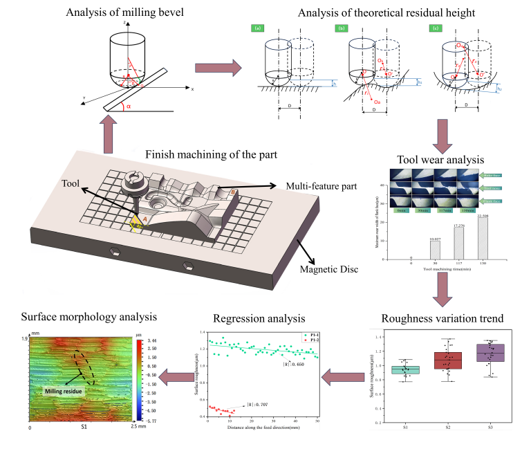 模具行业中的多特征标准件通常被广泛应用于检验机床加工精度及性能。该类零件具有平面、斜面、曲面等十几种复杂表面特征,在实际加工中极易产生表面多特征加工质量不一致的情况,成为复杂多特征零件加工中的一大技术难点。吴重军副教授团队从理论角度分析了刀具与材料接触倾斜角度和曲率变化等多因素的影响,并结合不同特征表面形貌、粗糙度和刀具磨损的实验结果,探讨了该零件表面质量一致性较差的原因。研究结果为改善多特征零件加工表面质量提供了重要指导。