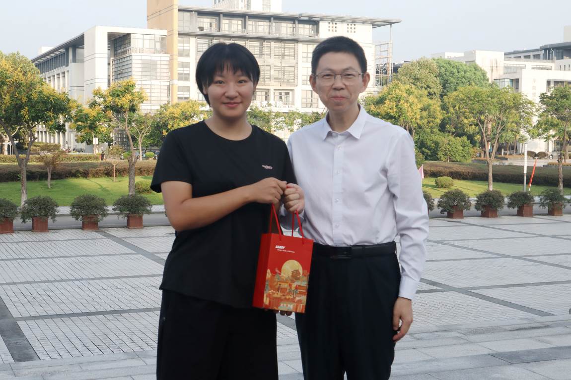 (院长单鸿波代表学院为孟金铭赠送寓意机械学子“携笔从戎”的定制钢笔)
