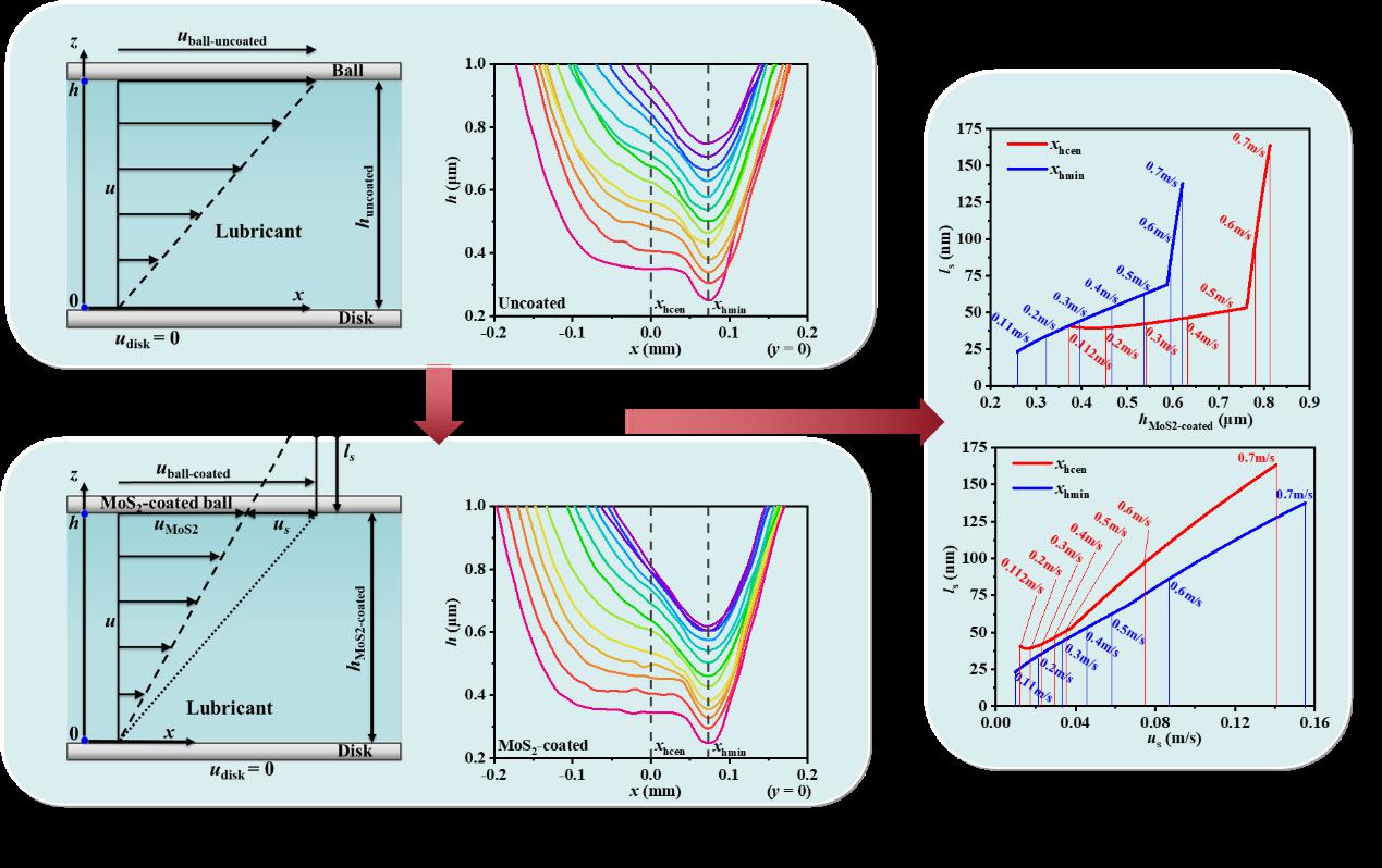 超滑(超低摩擦)是摩擦学研究的热点问题,而边界滑移是实现超滑的关键机制之一。王静教授团队将边界滑移理论与传统的热弹流润滑理论结合,建立了考虑速度滑移和温度滑移的线性滑移模型和受临界剪切力影响的非线性界面滑移模型,从理论层面提出了利用边界滑移实现减摩的新方法。在理论的指导下,利用镀膜技术开展弹流条件下钢/油界面滑移实验,实验过程中不仅验证了利用边界滑移实现减摩的可行性,并且创新性地提出了一种利用膜厚变化精确测量弹流条件下固-液界面滑移长度的方法,搭建了滑移长度-油膜厚度-摩擦系数之间的桥梁,迈出了油润滑弹流条件下实现超滑的关键一步。