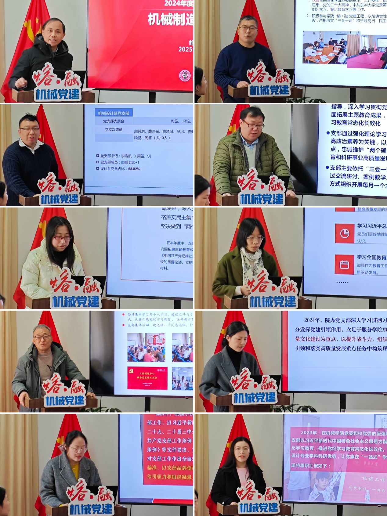 会上,机械制造系党支部书记鲍劲松、机械基础系党支部书记白云峰、机械设计系党支部书记周笛、机械电子系党支部书记盛晓伟、工业设计系党支部书记倪敏娜、机械实验中心党支部书记陈玉洁、工程训练中心党支部书记原一高、学院办公室党支部书记黄璐、筑梦创设本科生党支部书记王晓晖、筑梦创设“一站式”学生社区党支部书记王婷等10位同志分别就支部党建工作作了述职,既客观总结成绩、展示成果,又直面问题、深入分析原因,厘清了进一步改进工作的思路与规划。