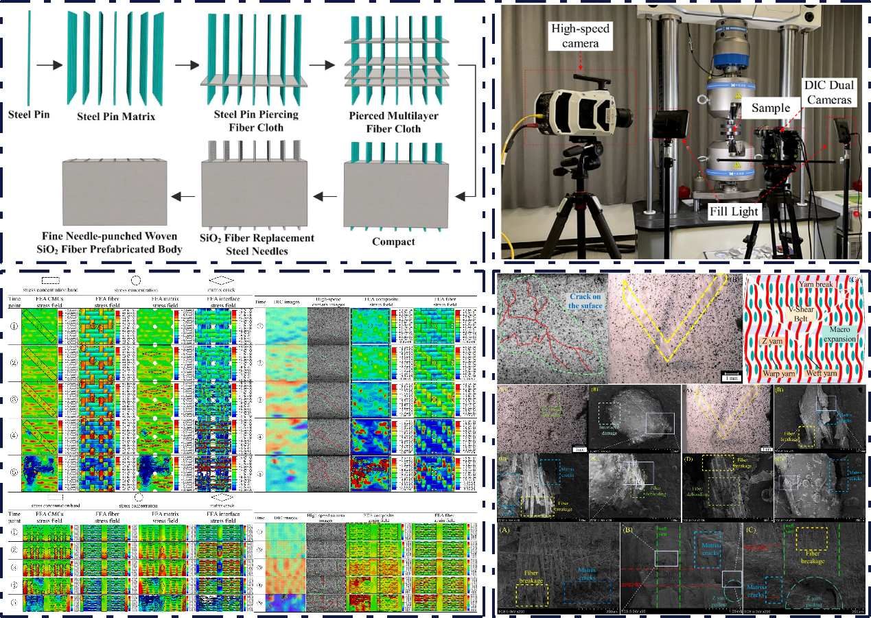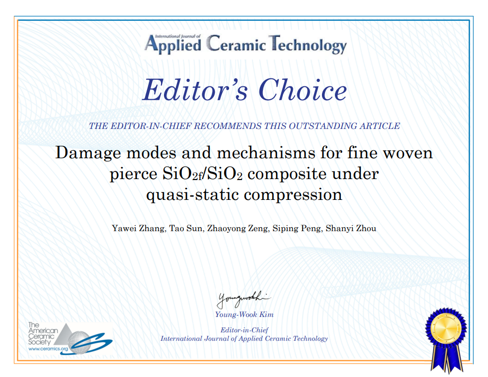张亚伟副教授团队运用有限元仿真和准静态力学试验方法,对细编穿刺SiO2f/SiO2复合材料准静态压缩行为进行研究,提出纤维编织耦合效应的观点,通过对材料应力场分布,经纬线重叠区域的应力场叠加和应力集中等现象的分析研究,结合界面损伤、基体裂纹、纤维脱粘和纤维断裂多种损伤形式,进一步揭示编织耦合效应在准静态受力过程中的作用和影响机制。该成果近期以“Damage modes and mechanisms for fine woven pierce SiO2f/SiO2 composite under quasi-static compression”为题发表于美国陶瓷学会会刊《International Journal of Applied Ceramic Technology》,欧乐电影 为唯一通讯作者单位,张亚伟副教授为第一作者,论文获得“Editor's Choice”杰出论文奖,文章链接://doi.org/10.1111/ijac.14989。