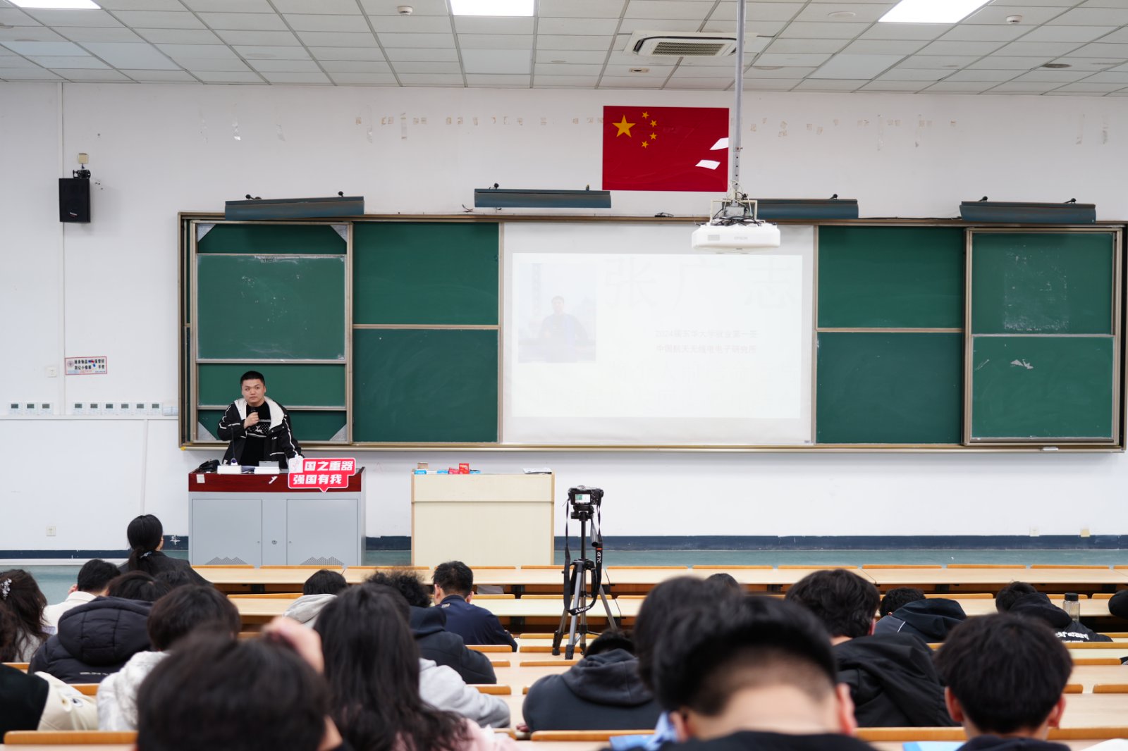 会上,正式启动“国之重器 强国有我”专题讲座,邀请到2024届硕士毕业生张广志作“铸强国之魂,圆飞天梦想”首讲。张广志讲述了他毕业后投身于中国航空无线电电子研究所的工作经历,在接近一年的工作过程中,他深切感受到强大国防力量的重要性,他表示,个人的前途发展与国家社会的需要其实是相辅相成、互相成就的。他寄语在场学生,要勇于担当起时代所赋予的重要使命,努力奋斗、攻坚克难,为实现民族复兴贡献青春和力量。